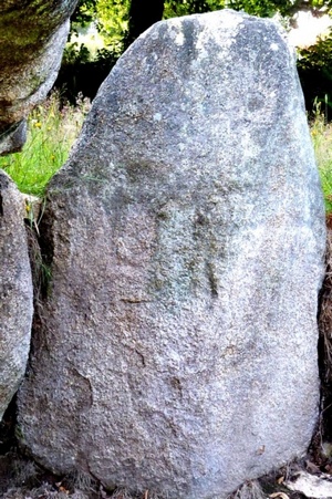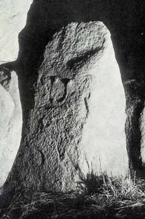 Cette figure dégagée en faible relief par piquetage, correspond à la représentation très stylisée, de la principale divinité vénérée au Néolithique, la "grande déesse" de la fécondité et de la mort évoquée pas ses seins et un grand collier (à moins que ce ne soit ses bras croisés sur la poitrine). Des figurations analogues se retrouvent à Prajou-Menhir (Trébeurden) et à Kerguntuil (Trégastel).