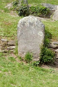 Presque face au couloir de l’entrée, légèrement à gauche, un des piliers d’une hauteur d’environ 1,80m, porte deux mamelons surmontant un arceau. Cette stèle s’amincit après un épaulement bien marqué. Les éléments sculptés se situent juste en dessous de l’épaulement.