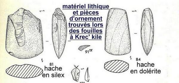 Le mobilier funéraire recueilli à Krec’h Kile ne représente qu’une partie des dépôts puisque toute l’extrémité ouest avait été vidée avant (sans doute bien avant) les travaux de Jean L’HELGOUARCH qui ont cependant permis de retrouver du matériel lithique, des pièces d’ornement et de la poterie: