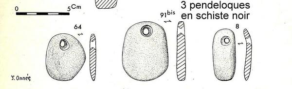 ° trois pendeloques en schiste noir : la plus grande, à forme trapézoïdale régulière,